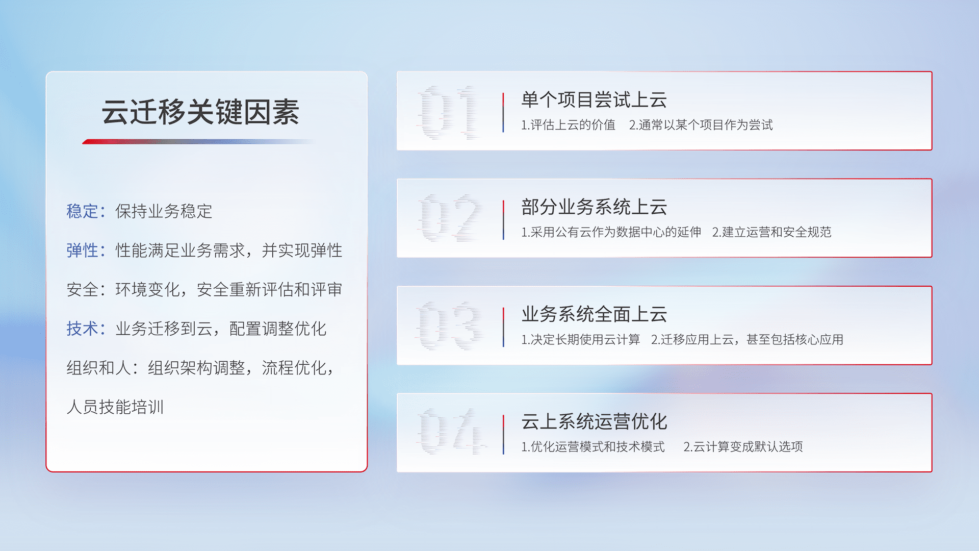 结合实际业务,,从规划设计、、云平台选型、、云原生改造、、、数据迁移、、集成交付,,,,迁移全过程为客户识别最佳上云路径,,,,做好风险识别管理,,,设计网络架构、、身份权限、、、、安全审计合规、、、操作审计、、、日志审计、、、监控告警策略、、、、多站点容灾设计等,,,,对云上基础设施进行整体规划,,,提升IT治理水平,,,以满足弹性、、、、高可用、、、、高性能的需求。。。。